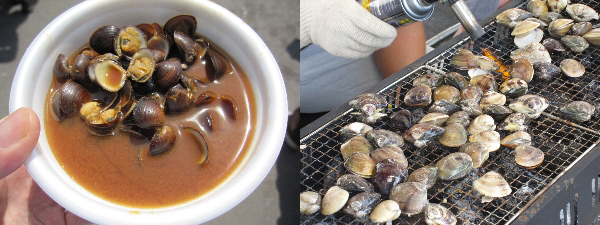 (右)次々と網にのせられ焼かれていくハマグリ。