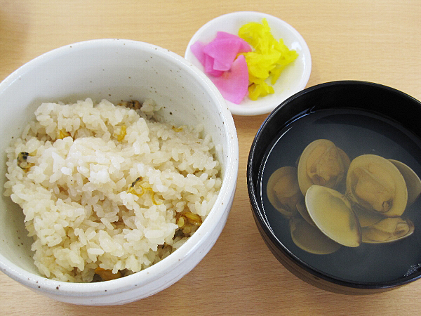 はまぐりの吸い物、アサリの炊き込みご飯が提供され、こちらはぎりぎりセーフ。