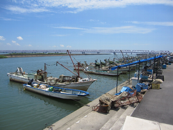 漁港にはのんびりとした空気がただよい、揖斐川がゆったりと流れていました。