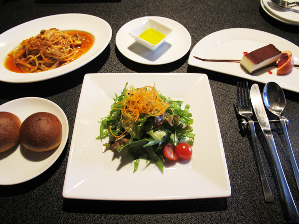 ロールパン・パスタ(きのことツナ)・オリーブオイル(パン用)・デザート(ティラミス)