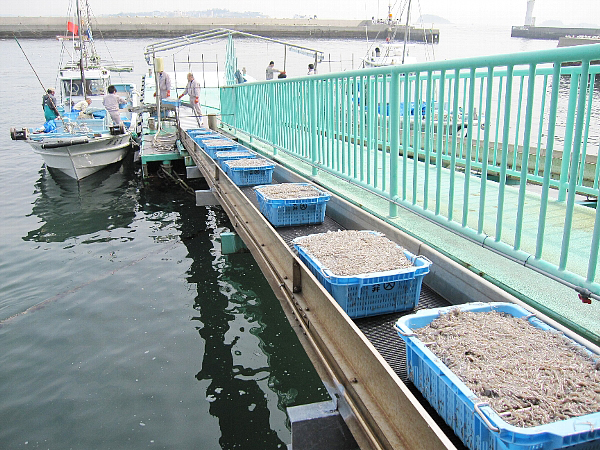 水揚げされたばかりのコウナゴを見ようと、漁港へ急ぎました。