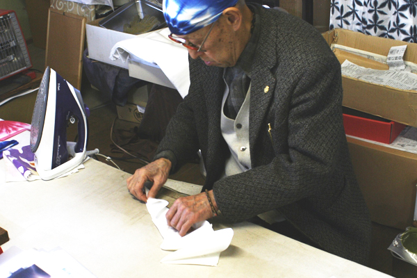 (左)独自の定規で、細長く折りたたまれた布にさらさらと線をひいていく正己さん。