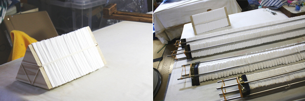 板締め絞、折縫いミシン絞どちらの技法も、まずはこの布を細長い帯状に折る、下折りという工程から。