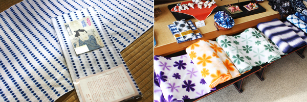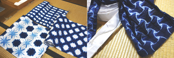 (右)こちらが折縫いミシン絞。板締め絞と違って全体を染料につけるため、白地が少ない。