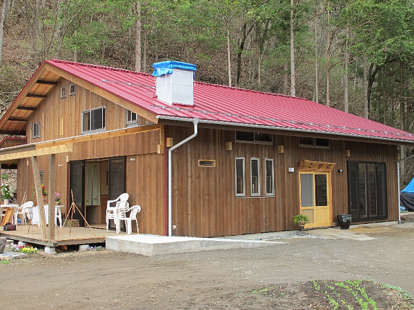 驚かさないようゆっくり車をすすめると、木目のあざやかな外壁がまぶしい赤い屋根の建物が見えてきます。