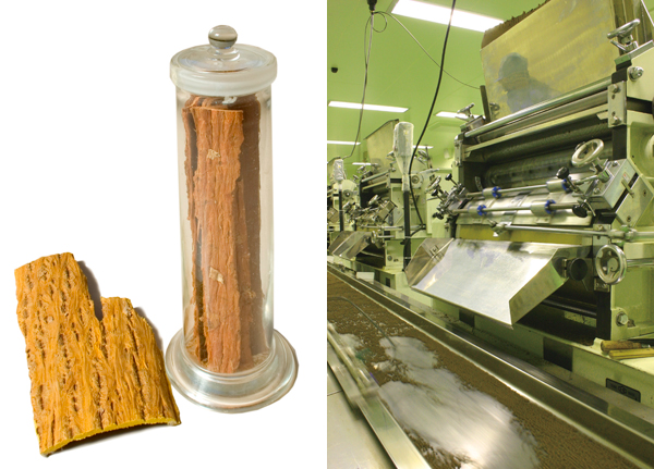 (右)オウバクエキスのみを板チョコ状へ固めた百草に対し、
