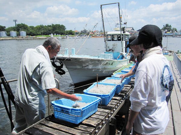 とれたばかりのシラスが次々と運びこまれていました。