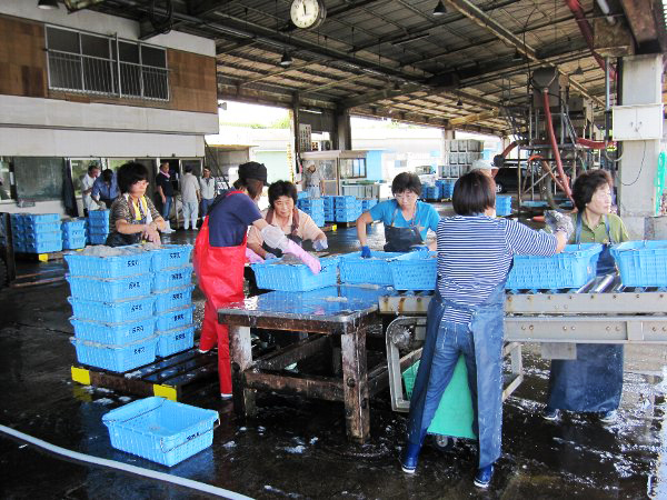 家族総出で行われる荷揚げの作業。漁はこうした女性の支えがあって成り立っています。