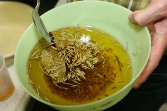 調理で使う塩焼きのアユは、スーパーで買った惣菜や前日に残ったものでも大丈夫。アユは鮮魚を使ってもよく、白身であればどんな魚でもおいしく味わえますよ。ソースで使うオリーブオイルは、ローズマリーや月桂樹などの香草や鷹の爪などを適量入れ、火を入れて冷ましたものを使うとより香りがでます。ニンニクの匂いが気になるようでしたら、使う量を減らすか除いてもよいでしょう。