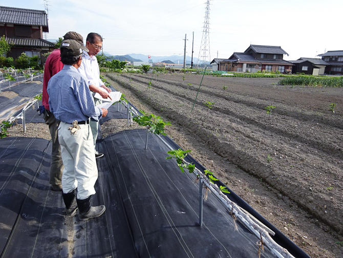 ㈫農業普及指導員の話に耳を傾ける生産者たち。減農薬、減化学肥料の農法は今まで以上に手間も時間もかかります