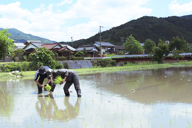 年間を通してイベントにも力を入れていている伊藤さん。2年前には体験者用の田んぼを整備し、「1000本プロジェクト@黒川」をスタート。「1000本プロジェクトは、京都府の塩見直紀さんという方が提唱しているもので、1本の苗からとれるお米はお茶碗1杯ぐらいなので、1000本の苗があれば1人1年分のご飯をほ賄えるという発想から始まったものです」。実際に体験をして共感した伊藤さんは、ここ黒川地区で実践。1枚の田んぼをいくつかの区画にわけ、参加者が田植え、草取り、稲刈りを行い、収穫したお米を持ち帰って食べるという、お米の自給体験を一通りできるようにしたもの。現在は、5グループが参加しています。
