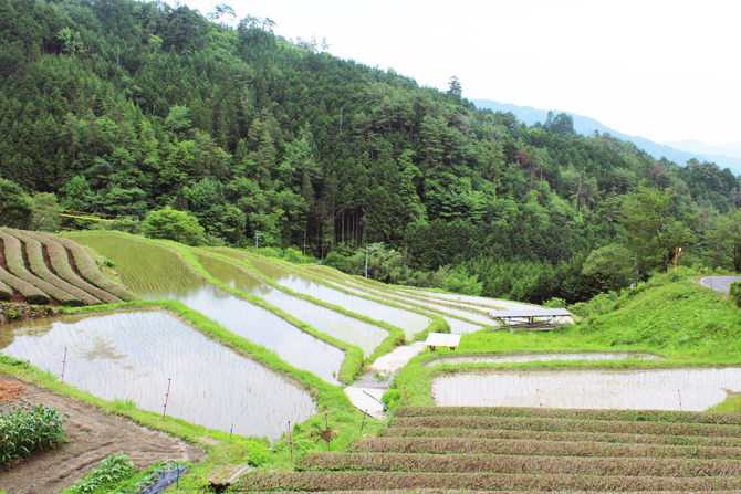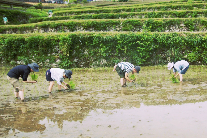 棚田は全部で10枚あり、広さは2反ほど。手押しの機械と手作業が中心です。「人の手が頼りということもあり、友人知人に声をかけ、田植えと稲刈りを体験してもらうイベントを行っています」。今年の田植えには3日で述べ40人訪れたと言います。