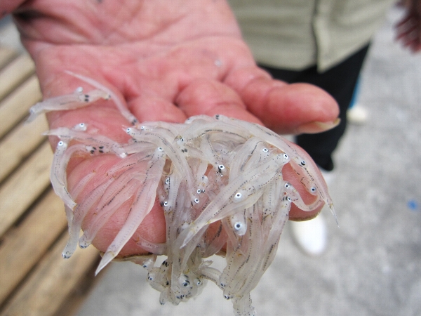 言われて手を差し出すと、つやつやのシラスを一つかみし、