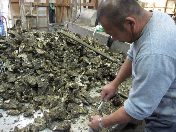 藤弘さんは収穫したカキを一つ手に取ってひらき、