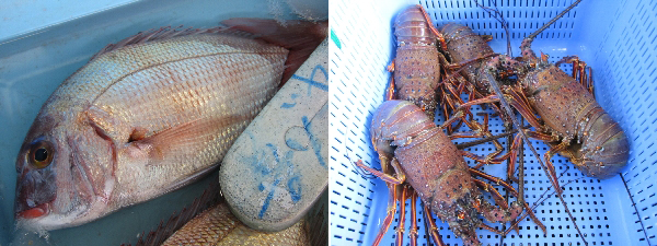 (右)どうしても見たかったイセエビ。20尾ほどが活きの状態でセリにかけられていました。
