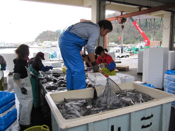 さらに進むと漁港の荷さばき場では、ちょうどまき網漁船が水揚げをしているところ。