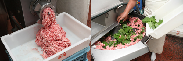 (右)香辛料と砕いた氷を加えてカッターで練り、そこへ青じその生葉を投入。