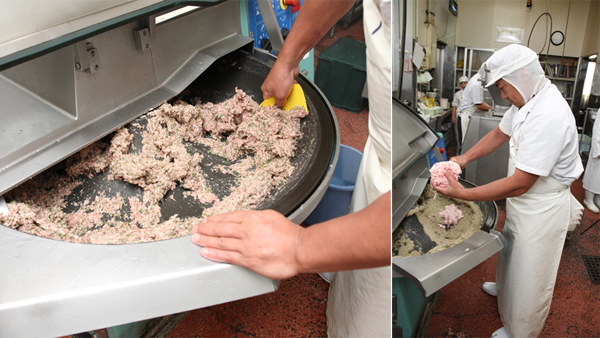 (右)出来上がった生地をスタッファー(充填機)に入れる。