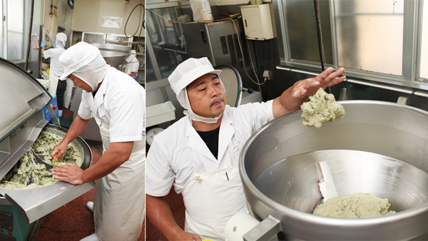 (右)練り具合、弾力、などを職人の手で確認し仕上げの段取りをする。