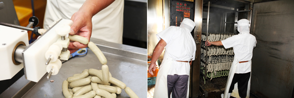 (右)羊腸に詰めたソーセージをスチームで蒸しあげる。