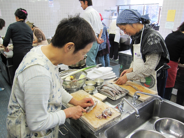 渥美半島の外海でとれたオキギスとエソを使って、全員で楽しく調理しました。