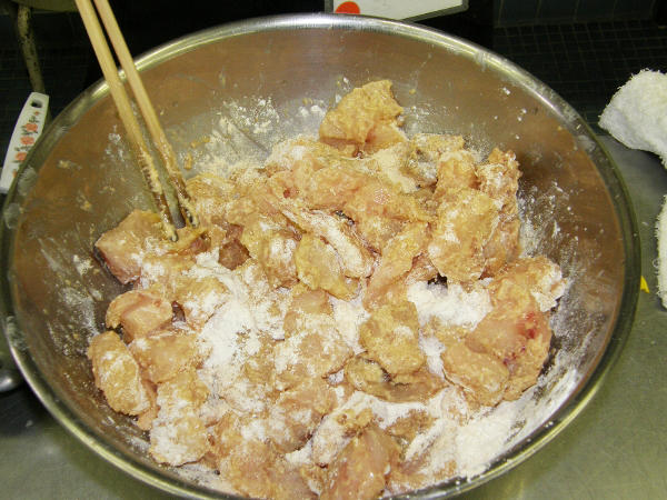 ドチザメの身は唐揚げ粉、小麦粉をまぶして油であげます。