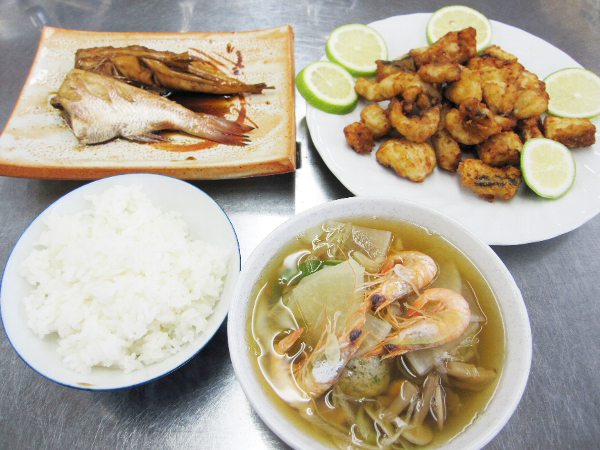 この日調理したメニュー。サルエビも入ったヒメジのつみれ汁、ドチザメの唐揚げ、