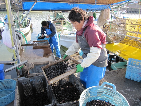 漁を終え帰港した船からはたくさんのヤマトシジミが揚がり、